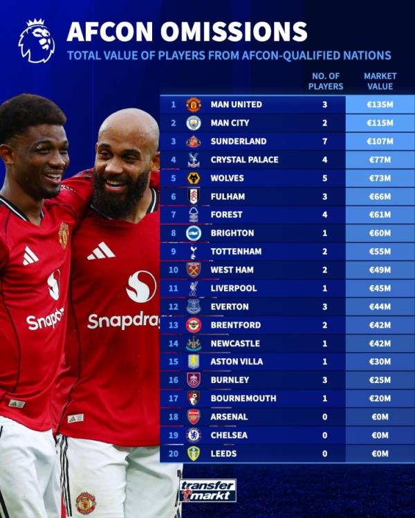 11月21日讯 德国转会市场统计了英超各队将参加非洲杯球员的身价,并列出排名,曼联1.35亿欧居首,曼城1.15亿欧次席。