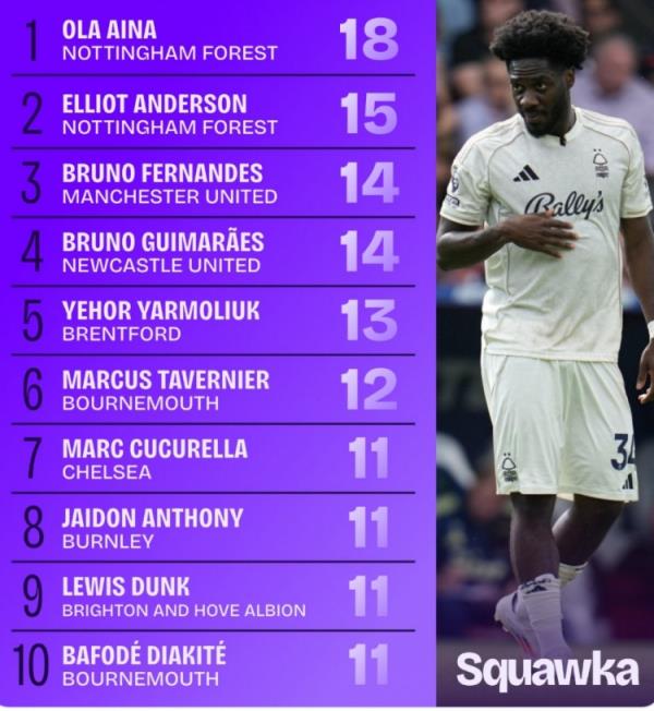 8月28日讯 Squawka统计了英超前两轮比赛球员夺得球权的次数,并列出榜单,诺丁汉森林后卫埃纳18次居首,其中10次来自对阵水晶宫的比赛。