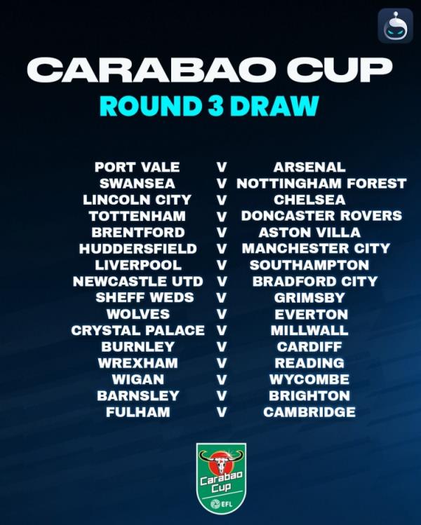 8月28日讯 英格兰联赛杯第三轮抽签结果揭晓,具体如下: