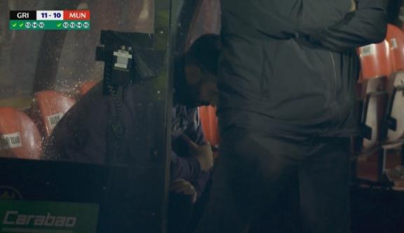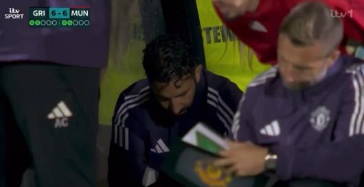 点球大战进行中时,镜头给到阿莫林,阿莫林坐在教练席上,他低着头没有看向场上。