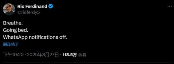 费迪南德写道:“深呼吸,睡觉去了。WhatsApp(通讯软件)的通知已关闭。”