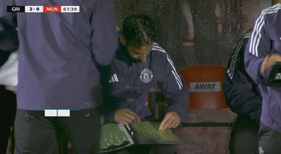 08月28日讯 联赛杯曼联vs格林斯比,第62分钟镜头给到场边,阿莫林在场边拿着战术板。