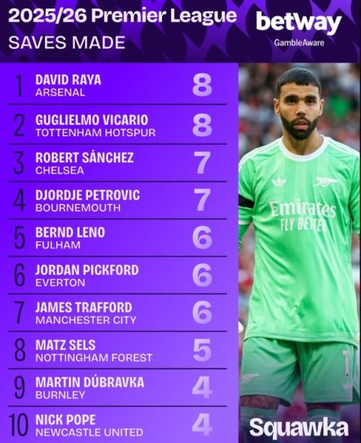 8月28日讯 本赛季英超已经进行两轮比赛,阿森纳的拉亚和热刺的维卡里奥以8次并列扑救榜榜首,而且两人把守的球门迄今为止还未丢球。
