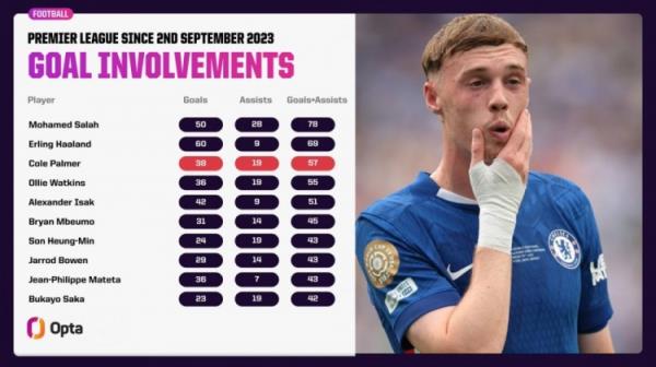 11月21日讯 切尔西主帅马雷斯卡确认帕尔默因意外受伤将再次推迟复出,opta数据统计显示他对切尔西无比重要。自他为切尔西首秀以来共计在英超直接参与57球,同期仅次于萨拉赫和哈兰德。