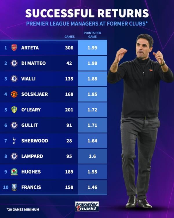 11月21日讯 德国转会市场统计了教练执教球员时代英超老东家的场均积分,并列出榜单,阿尔特塔1.99分居首,迪马特奥1.98分次席。