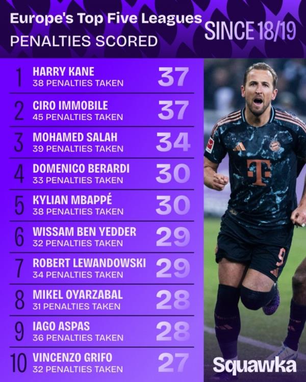 11月21日讯 Squawka统计了2018-2019赛季以来球员在五大联赛的点球进球数量,并列出榜单,凯恩、因莫比莱37球居首,萨拉赫34球第三。