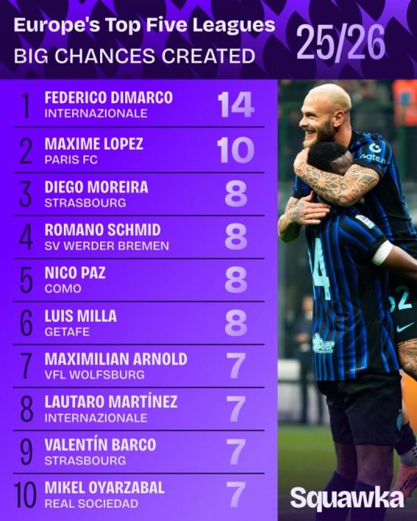 11月21日讯 Squawka统计了本赛季球员在五大联赛创造重大机会的次数,并列出榜单,迪马尔科创造14次重大机会最多。