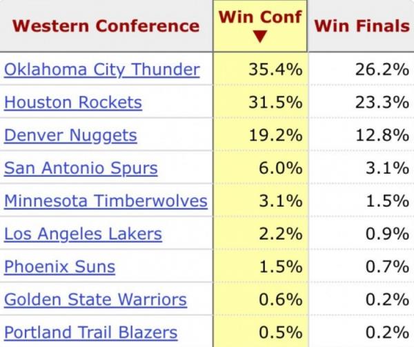 11月21日讯 据数据网站Basketball Reference预测,火箭本赛季拿下西部冠军的概率是31.5%,夺冠概率是23.3%,两项数据均西部第二高,仅次于雷霆(35.4%和26.2%)。