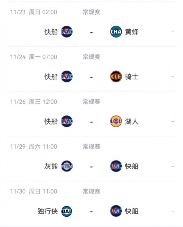 快船后面5场比赛赛程如下: