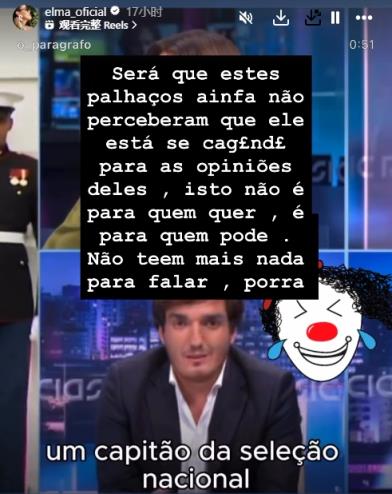 C罗大姐埃尔玛也对评论员若昂·若内特(João Maria Jonet)在 SIC 新闻台上的言论作出反击。该评论员称C罗的白宫之行 “令他感到震惊”,埃尔玛在社媒上回击:“这些小丑们难道还没搞明白吗?他xx根本不在乎他们的看法。这可不是谁想做就能做的事,而是有能力的人才能做到的。他们xx真是没别的话可说了!”
