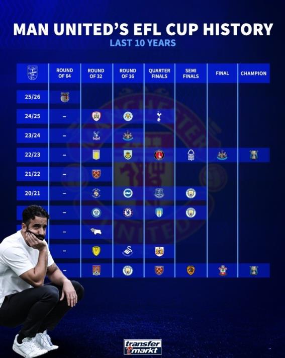 据德转统计,在该项赛事第二轮便遭到淘汰,这也创下了曼联近10年参加联赛杯最差战绩。