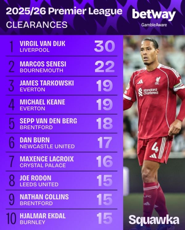 8月28日讯 新赛季英超两轮战罢,据Squawka的数据统计,利物浦中卫范迪克在两场比赛中共有30次解围,在所有球员中最多。