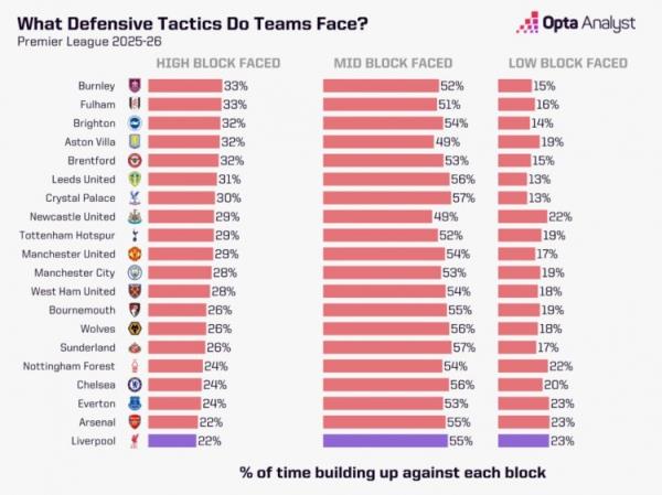 11月21日讯 据Opta统计,利物浦在每场英超比赛中的平均控球率为60.7%,高于任何其他球队,而他们78%的比赛时间面对中位或低位防守,是联赛中最高的。