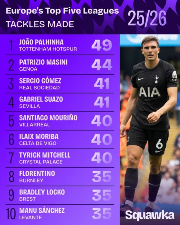 11月21日讯 Squawka统计了本赛季球员在五大联赛成功抢断的次数,并列出榜单,帕利尼亚49次居首。
