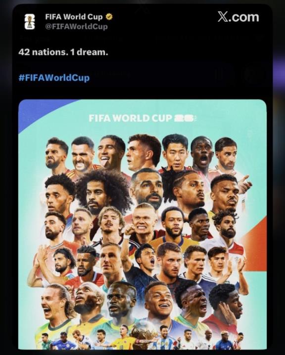 11月21日讯 11月19日,各大洲世预赛结束,42支直通球队出炉,当晚世界杯官推发布了42队海报,配文“42个国家,一个梦想”。海报中,每支球队有一位代表球星,其中B费代表葡萄牙出镜,海报中无C罗引发争议。