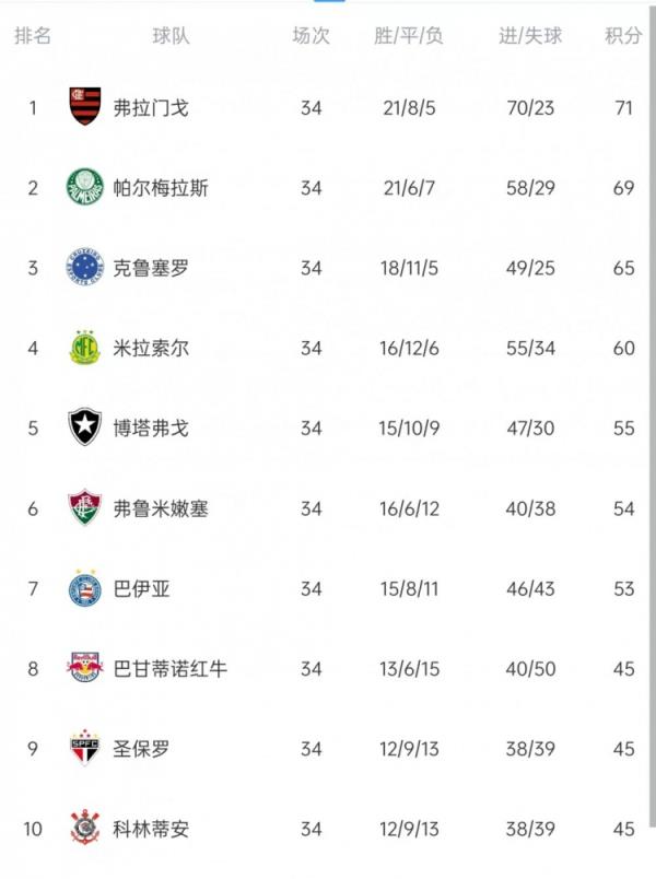 注:本赛季解放者杯决赛弗拉门戈vs帕尔梅拉斯,将有一队以卫冕冠军身份获得下赛季参赛资格,因此巴甲的解放者杯参赛资格顺延至前7名。